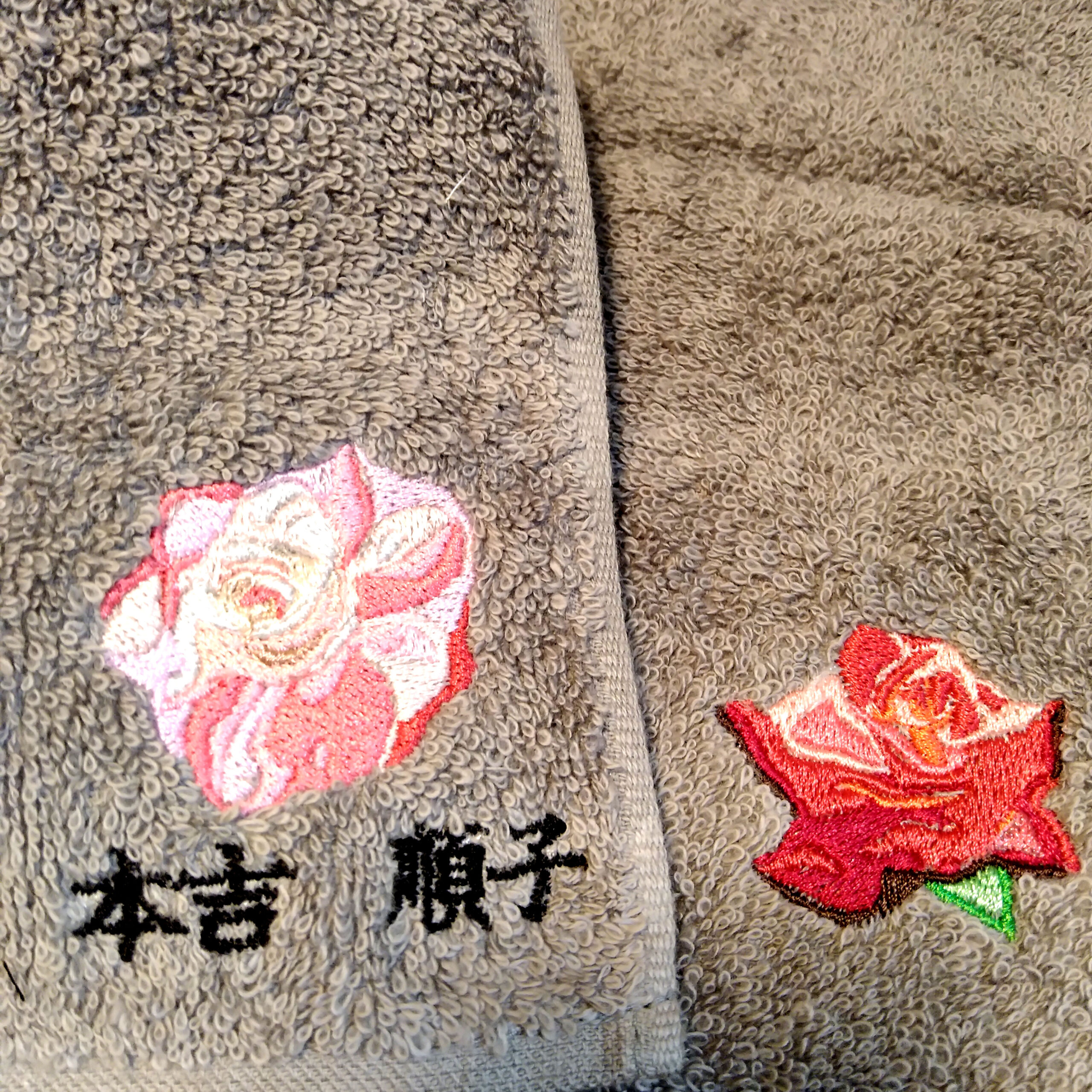 今回、バラ椿刺繍を入れたタオルハンカチを、贈答用にとオーダーいただきました! 刺繍の糸の幅がありますので、あまり細かいデザインには不向きですが、相談しながらこのサイズのイラストなら大丈夫、と 作成したものが写真のデザイン…